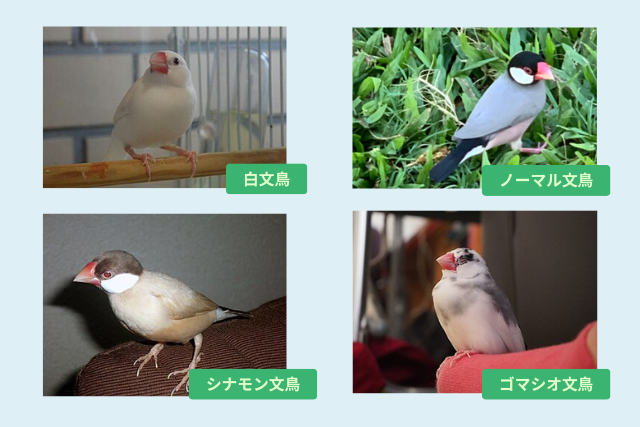- 桜文鳥:ノーマル文鳥と白文鳥の交配によって生まれた品種(ノーマル文鳥の配色に、白文鳥由来の白いまだら模様(パイド)が混じっている)