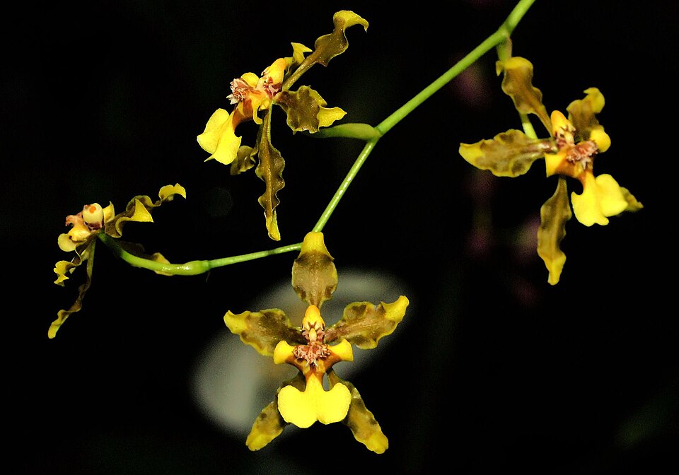 また、オンシジウム属 (Oncidium) の一部の種、例えば「オンシジウム・ヒファエマティクム(Oncidium hyphaematicum)」や「オンシジウム・プラニラブレ(Oncidium planilabre)」などは、さらに風変わりな擬態戦略をとることで知られています。このランの花は、なんと縄張り意識の非常に強い雄のハチやハナバエの姿にそっくりなのです。
