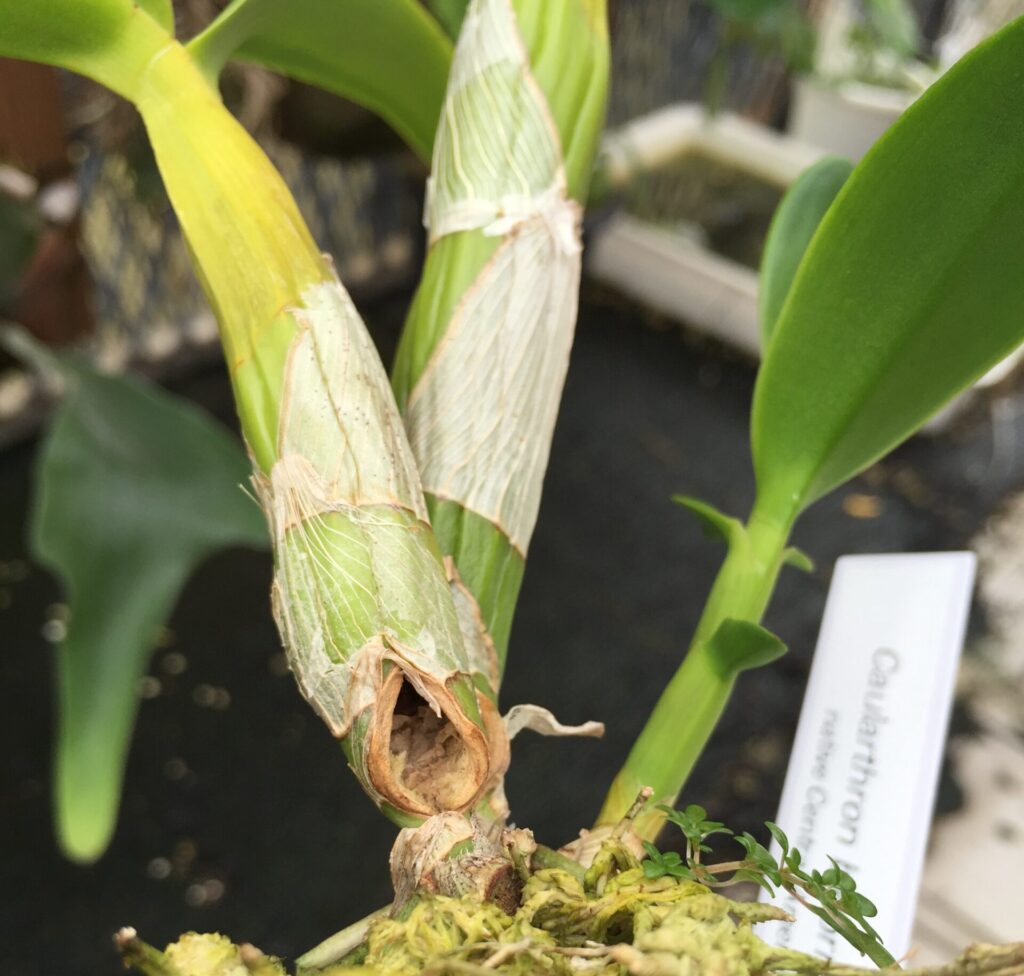 アリたちは、このランの偽茎の中にせっせと巣を作り、そこへ自分たちの食べ残しや昆虫の死骸、植物の細かな破片などを運び込みます。これらは、ランにとって貴重な栄養となります。