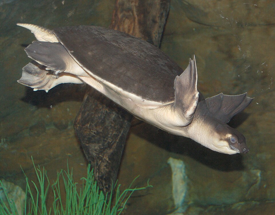 スッポンモドキは約1億4000万年前から基本的な形態を変えていない「生きている化石」として知られ、ウミガメのような鰭状の前肢を持つ淡水ガメです。口元の「豚の鼻」のような吻(びん)が触覚として発達しており、濁った川底で微小な貝や甲殻類を探り当てるのに役立っています。