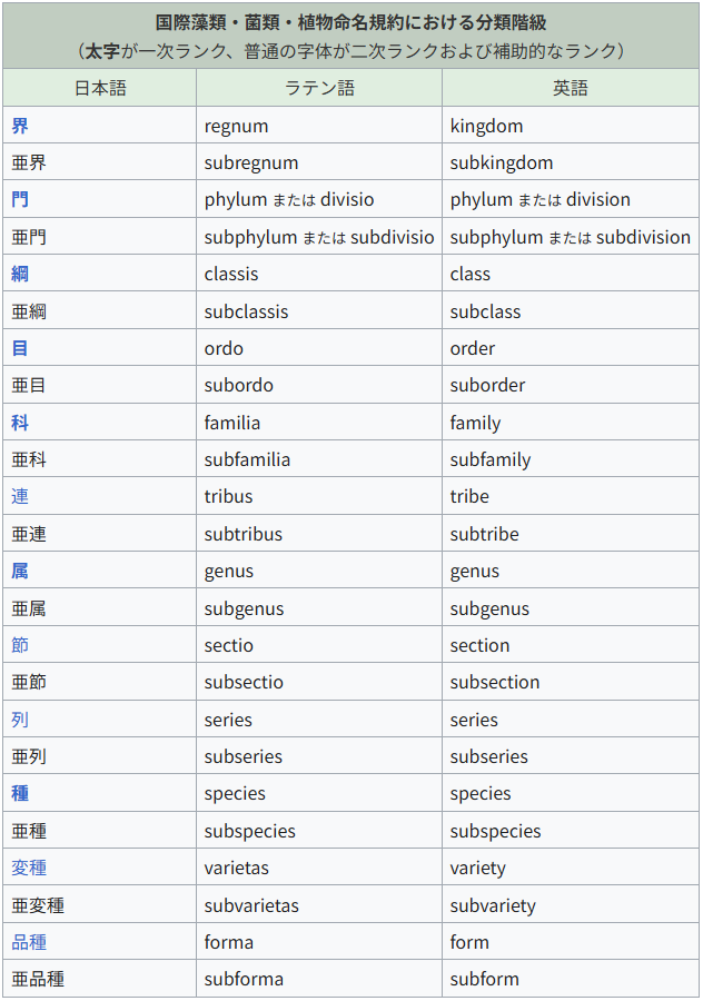 同様に、「目」の下には「亜目」、「科」の下には「亜科」があり、たとえばバラ科では「バラ亜科」「サクラ亜科」などに分けられることがあります。また、「種」の下には「亜種(subspecies)」が設けられ、地理的な違いなどによって区別される場合があります。