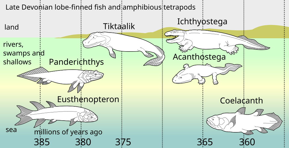 四肢の誕生は、古生代デボン紀(約4億1600万年前〜3億5900万年前)と考えられています。シルル紀後期に肉鰭類(にくきるい、Sarcopterygii)※から分岐した系統が、