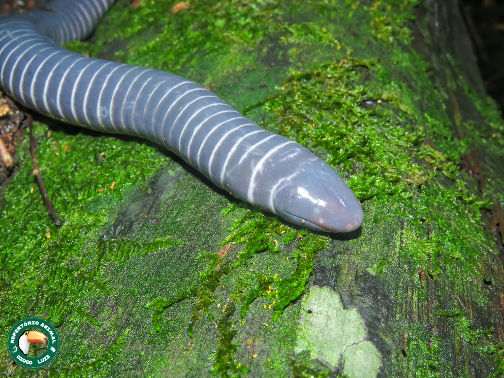 シフォノプス・アヌラトゥス(仮)は、英語では 「Ringed Caecilian」と呼ばれ、青黒い体に白い帯のような模様が入る、美しい地中の生き物です。体長はふつう30〜45cm、最大で70cmを超える個体も知られています。