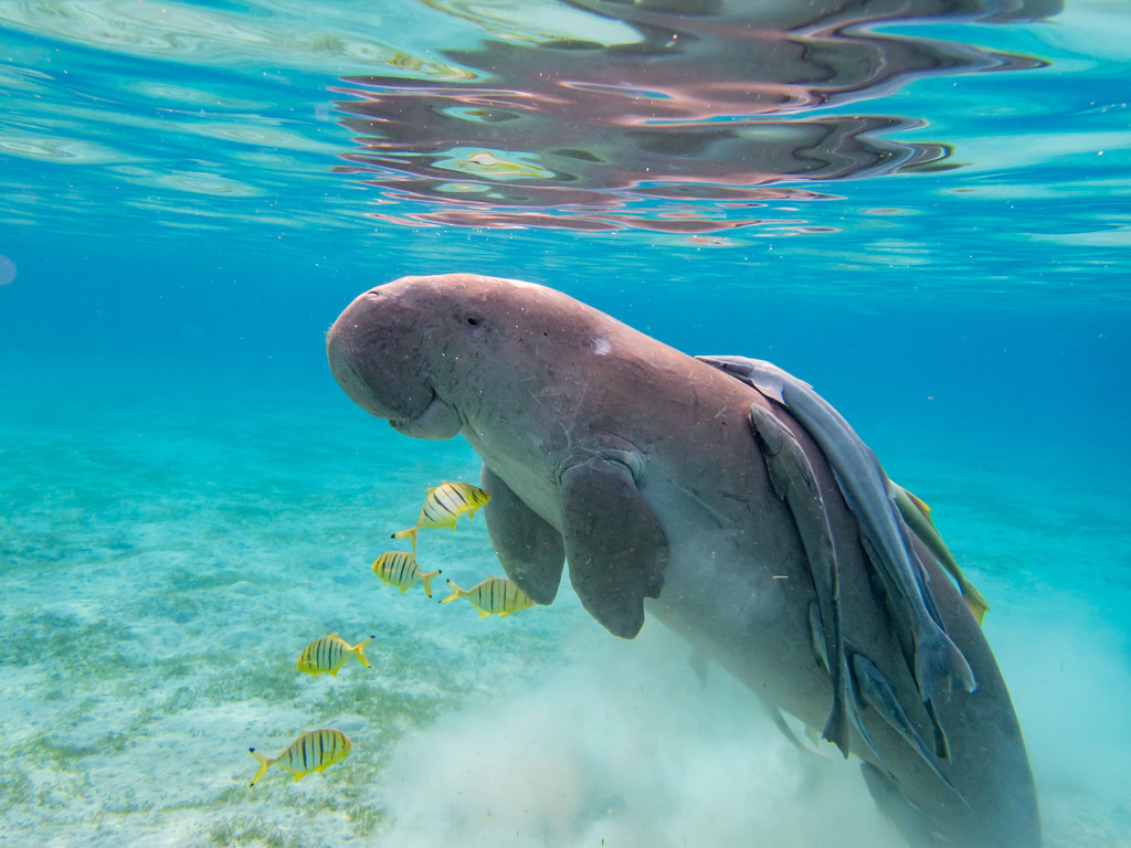 ジュゴンという名はマレー語の「海の女性」に由来し、海外でも「Dugong」と呼ばれています。穏やかな性質の草食哺乳類です。