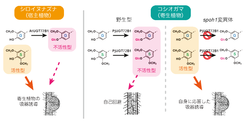 実際に、この「UGT72B1」酵素が機能しなくなったコシオガマ(spoh1変異体)では、自己回避ができなくなり、自分自身のシグナルに反応して自分の根に吸器を形成しようとする現象が確認されています。