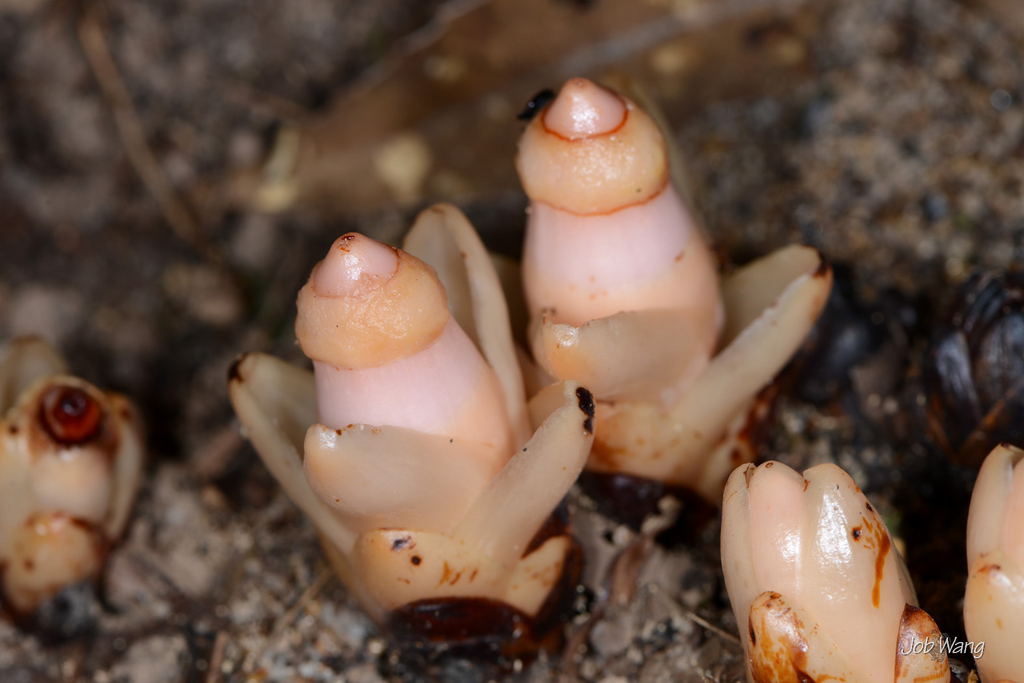 ヤッコソウ属(Mitrastemon )は、世界でもわずか2種からなる、分類学的にも希少なヤッコソウ科の植物です。ヤッコソウはエンドパラサイトで、葉緑素を持たず、ブナ科樹木の根に内部寄生し花だけを地表に出します。