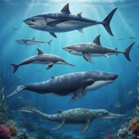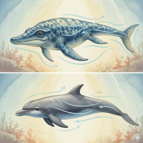 収斂進化の中でも水中での「流線型ボディ」は、わかりやすい例です。魚類のマグロやサメ、海生哺乳類のイルカやクジラ、そして絶滅した海生爬虫類である魚竜(イクチオサウルス類)は、進化の出発点も生きた時代も大きく異なりますが、成熟した姿は驚くほど似ています。