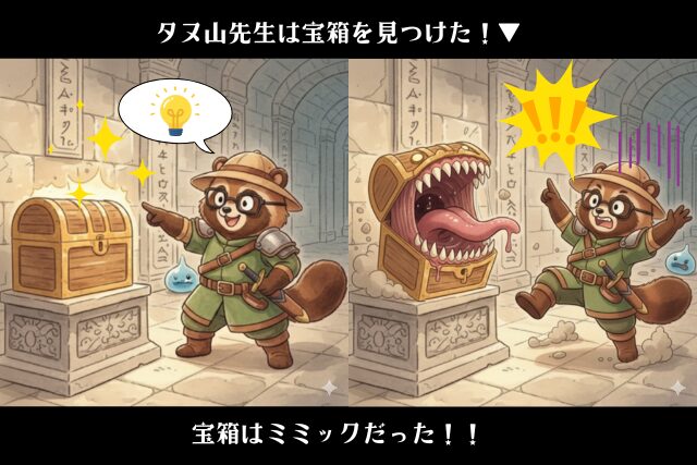 いくつかのゲームでも宝箱のふりをして待ち伏せしている敵「ミミック」がダンジョンで登場しますね!